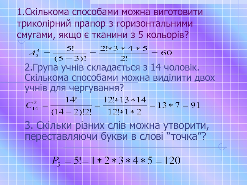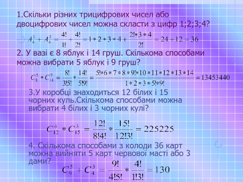 3.У коробці знаходиться 12 білих і 15 чорних куль.Скількома способами можна вибрати 4 білих і 3 чорних кулі?