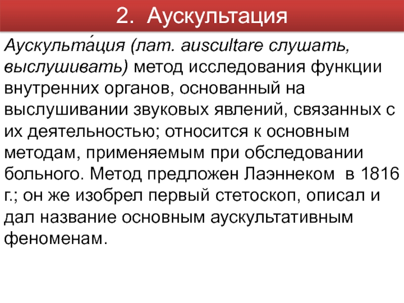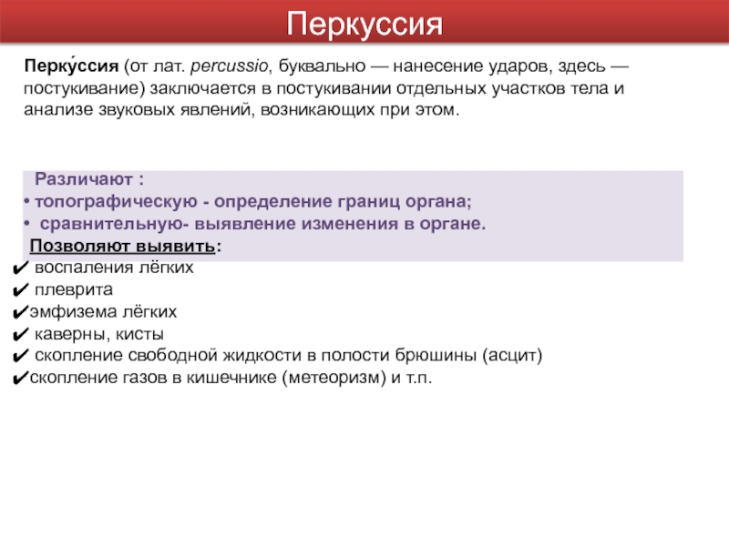 Перку́ссия (от лат. percussio, буквально — нанесение ударов, здесь — постукивание) заключается в постукивании отдельных участков тела и анализе звуковых явлений, возникающих при этом.