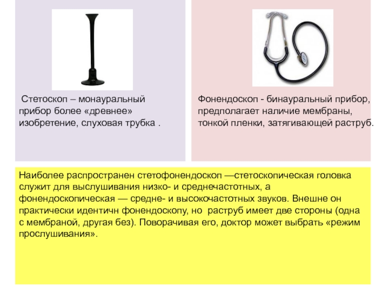 Наиболее распространен стетофонендоскоп —стетоскопическая головка служит для выслушивания низко- и среднечастотных, а фонендоскопическая — средне- и высокочастотных звуков. Внешне он практически идентичн фонендоскопу, но раструб имеет две стороны (одна с мембраной, другая без). Поворачивая его, доктор может выбрать «режим прослушивания».