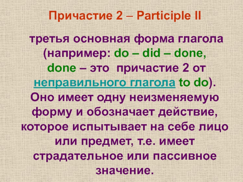 Оно имеет одну неизменяемую форму и обозначает действие, которое испытывает на себе лицо или предмет, т.е. имеет страдательное или пассивное значение.