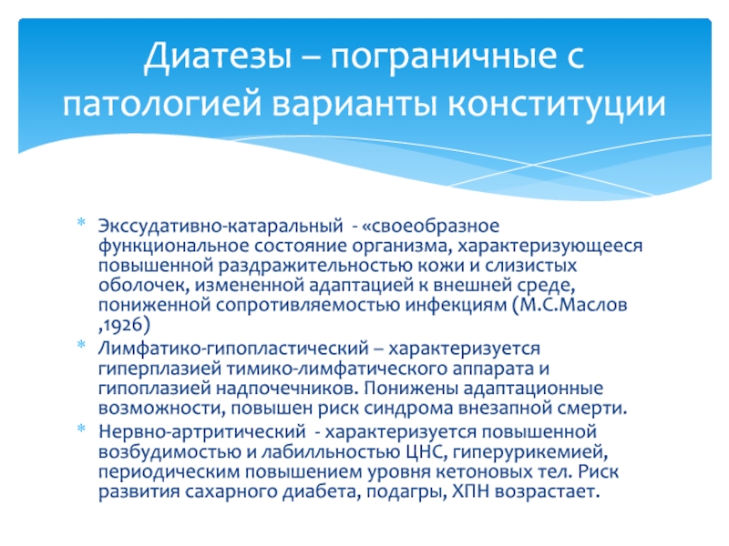 Лимфатико-гипопластический – характеризуется гиперплазией тимико-лимфатического аппарата и гипоплазией надпочечников. Понижены адаптационные возможности, повышен риск синдрома внезапной смерти.
