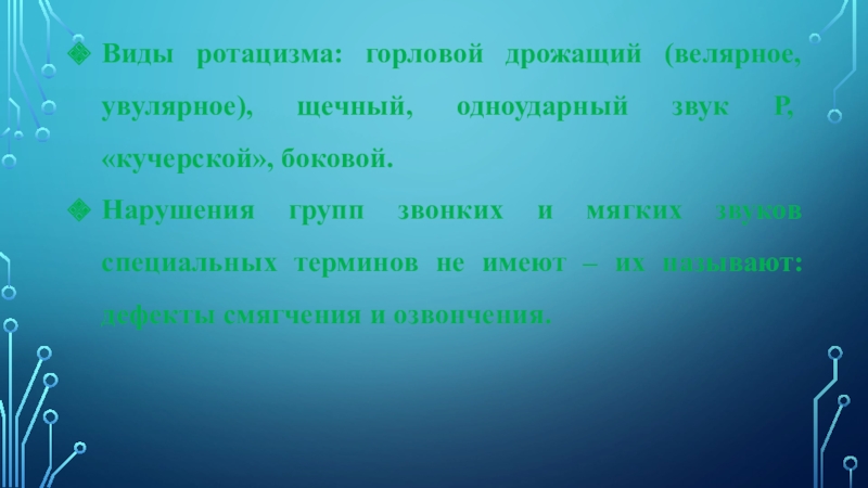 Слайд 15Виды ротацизма: горловой дрожащий (велярное, увулярное), щечный, одноударный звук Р,