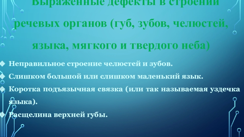 Слайд 7Выраженные дефекты в строении речевых органов (губ, зубов, челюстей, языка,