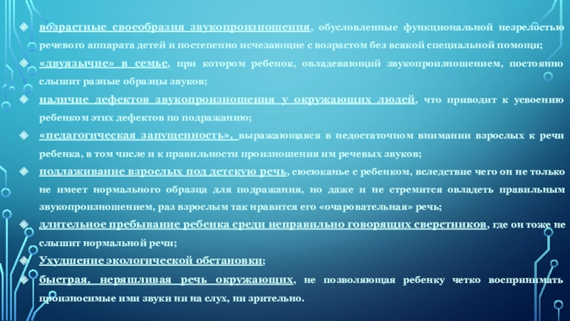 «педагогическая запущенность», выражающаяся в недостаточном внимании взрослых к речи ребенка, в том числе и к правильности произношения им речевых звуков;