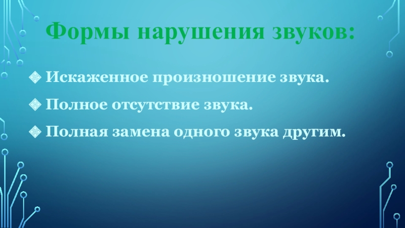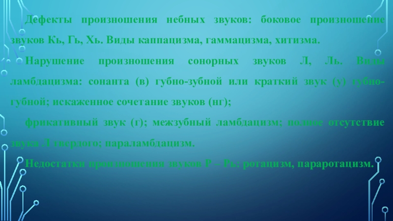 фрикативный звук (г); межзубный ламбдацизм; полное отсутствие звука Л твердого; параламбдацизм.