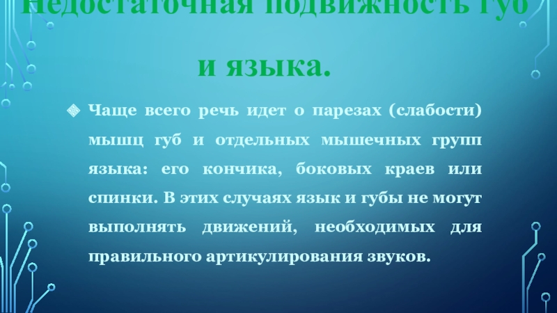 боковых краев или спинки. В этих случаях язык и губы не могут выполнять движений, необходимых для правильного артикулирования звуков.
