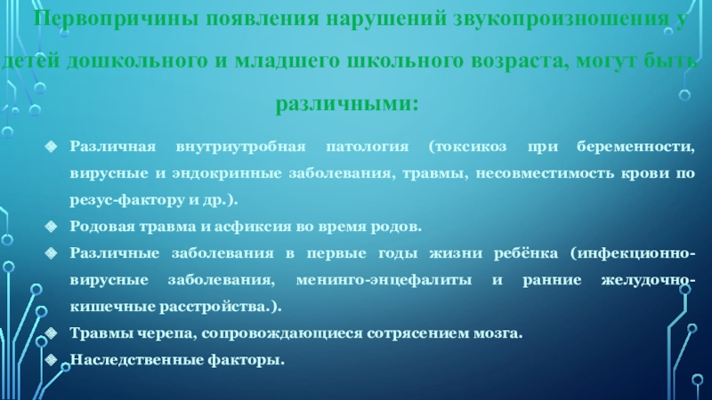 Слайд 3Первопричины появления нарушений звукопроизношения у детей дошкольного и младшего школьного