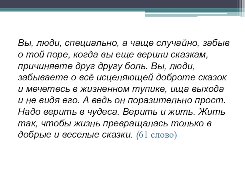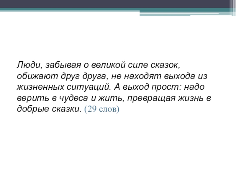 люди, забываете о всё исцеляющей доброте сказок и мечетесь в жизненном тупике, ища выхода и не видя его. А ведь он поразительно прост. Надо верить в чудеса. Верить и жить. Жить так, чтобы жизнь превращалась только в добрые и веселые сказки. (61 слово)