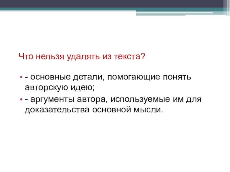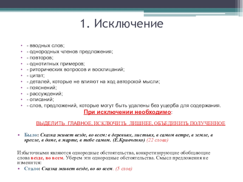 - слов, предложений, которые могут быть удалены без ущерба для содержания.
