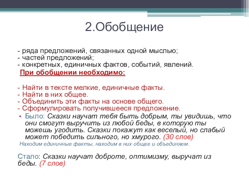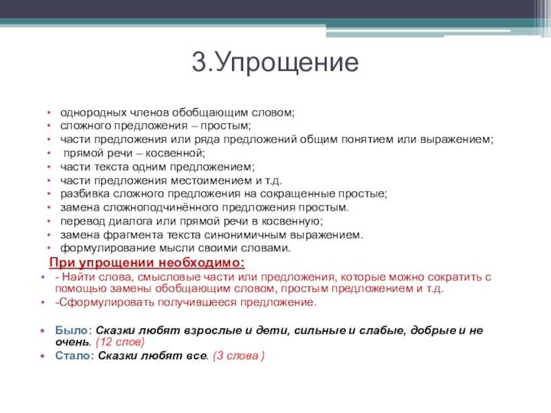 - Найти слова, смысловые части или предложения, которые можно сократить с помощью замены обобщающим словом, простым предложением и т.д.