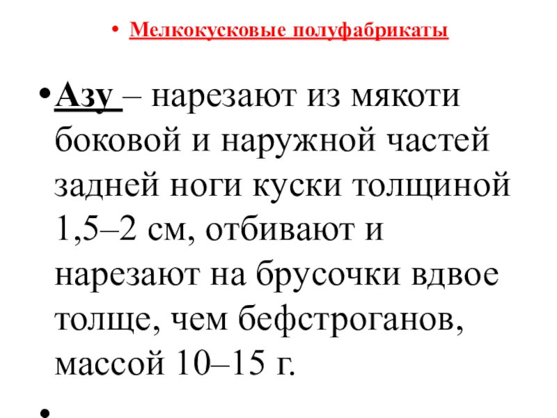Мелкокусковые полуфабрикаты Азу – нарезают из мякоти боковой и наружной частей задней ноги куски толщиной 1,5–2 см,