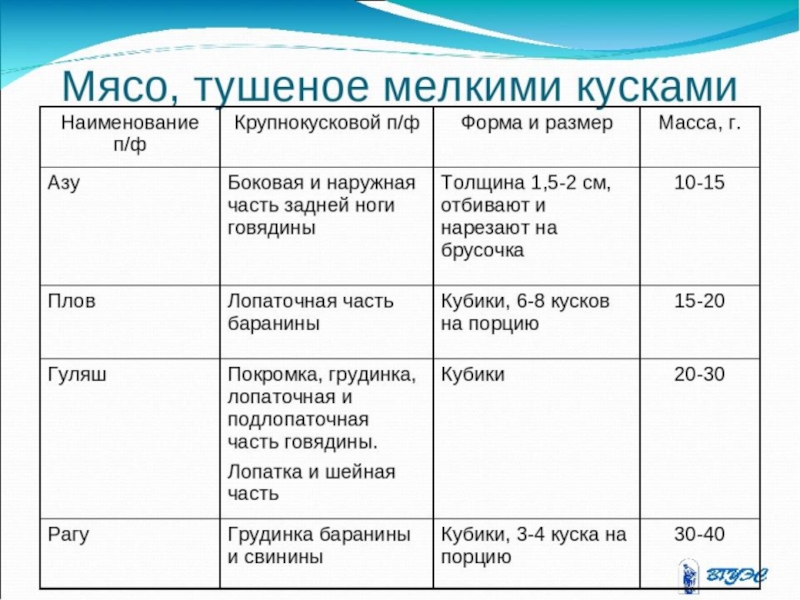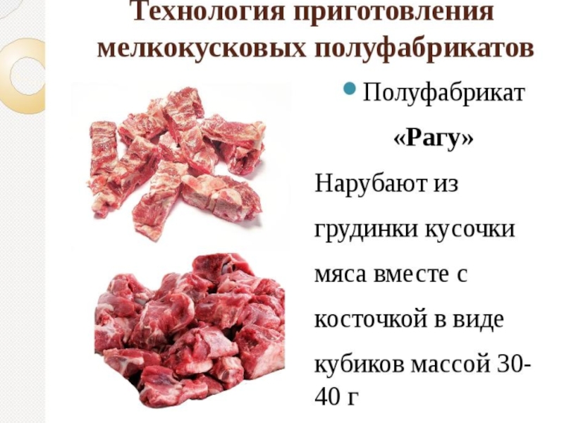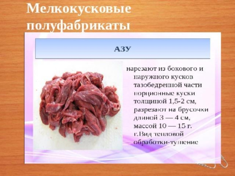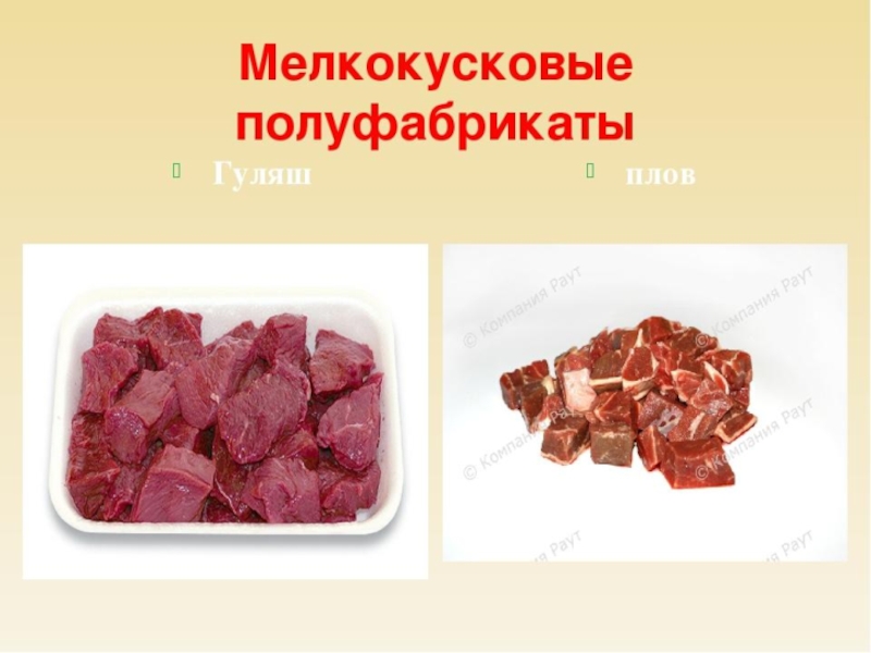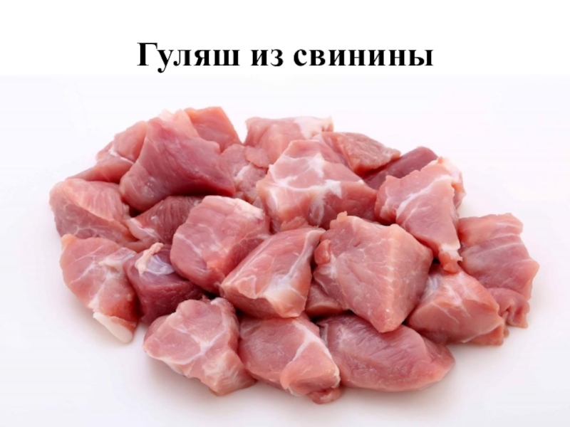 Слайд 1Приготовление мелкокусковых полуфабрикатов для тушения из говядины и свинины