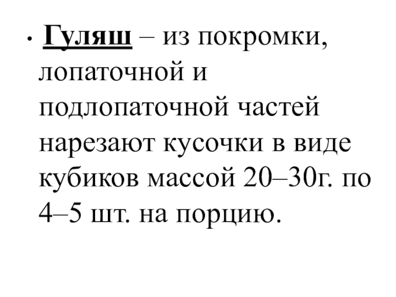 Гуляш – из покромки, лопаточной и подлопаточной частей нарезают кусочки в виде кубиков массой 20–30г. по