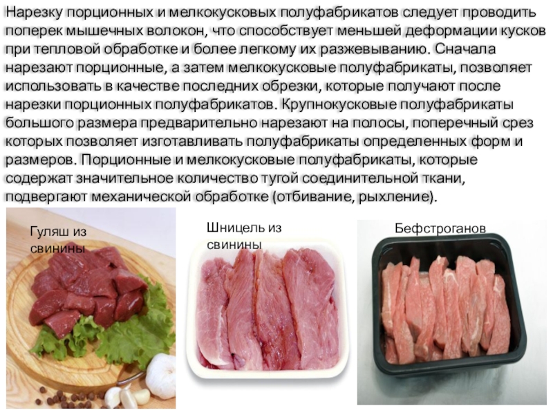 Нарезку порционных и мелкокусковых полуфабрикатов следует проводить поперек мышечных волокон, что способствует меньшей деформации кусков при тепловой
