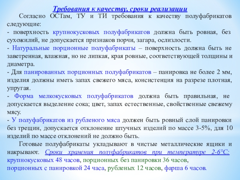 - Форма мелкокусковых полуфабрикатов должна быть правильная, не допускается выделение сока; цвет, запах естественные, свойственные свежему мясу.