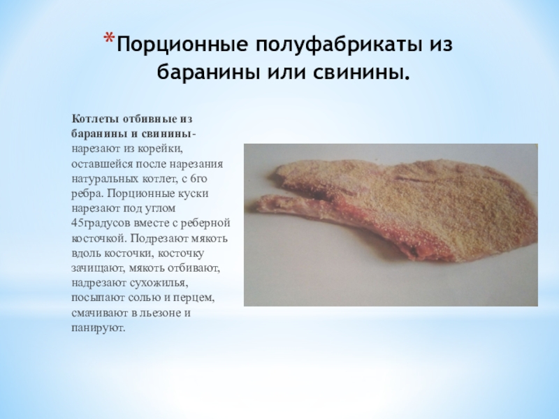 Слайд 20Порционные полуфабрикаты из баранины или свинины.