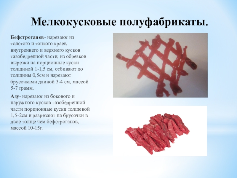 Азу- нарезают из бокового и наружного кусков тазобедренной части порционные куски толщеной 1,5-2см и разрезают на брусочки в двое толще чем бефстроганов, массой 10-15г.