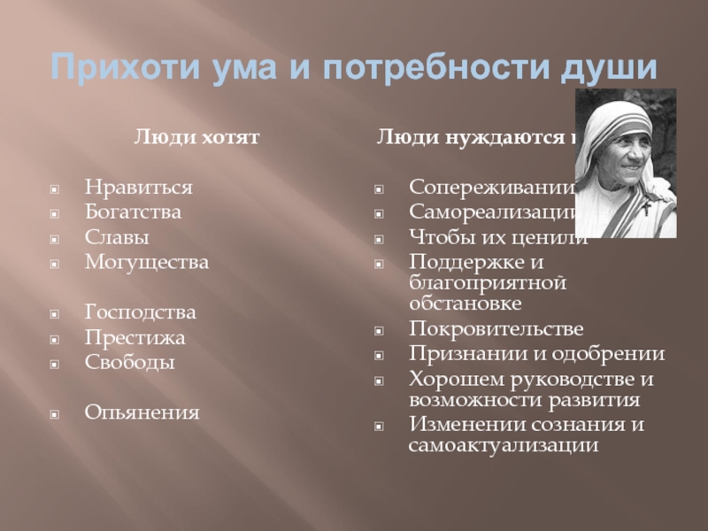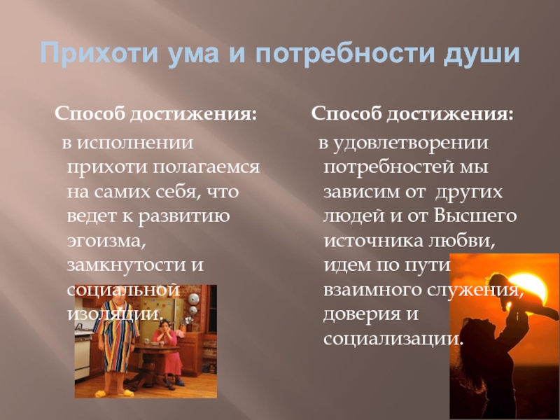в удовлетворении потребностей мы зависим от других людей и от Высшего источника любви, идем по пути взаимного служения, доверия и социализации.