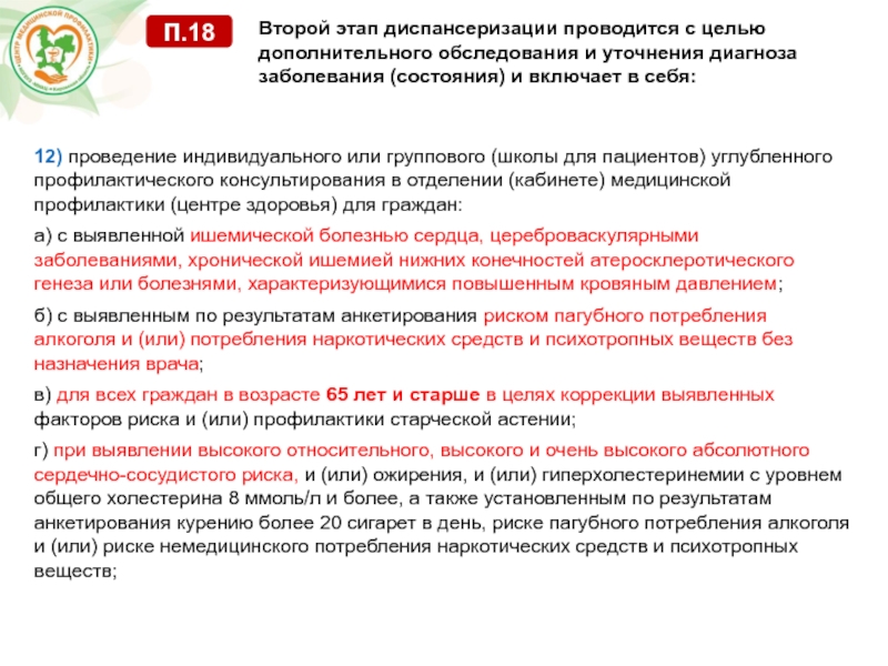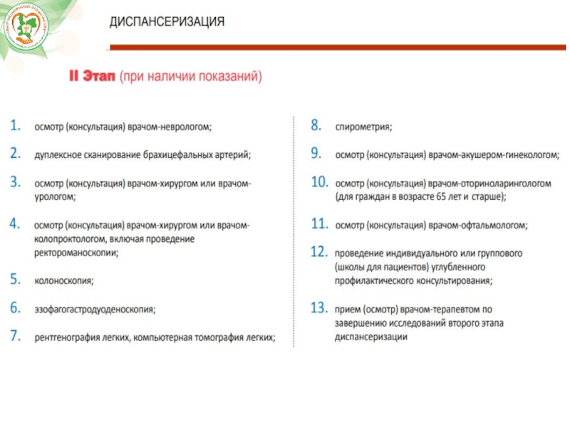 Второй этап диспансеризации проводится с целью дополнительного обследования и уточнения диагноза заболевания (состояния) и включает в себя:
