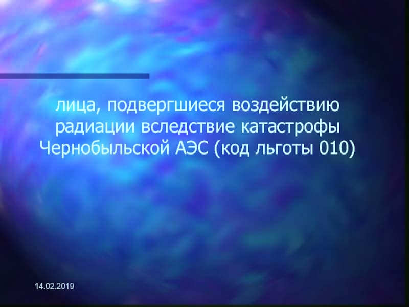 Слайд 3лица, подвергшиеся воздействию радиации вследствие катастрофы Чернобыльской АЭС (код льготы