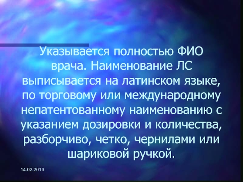 Слайд 17Указывается полностью ФИО врача. Наименование ЛС выписывается на латинском языке,