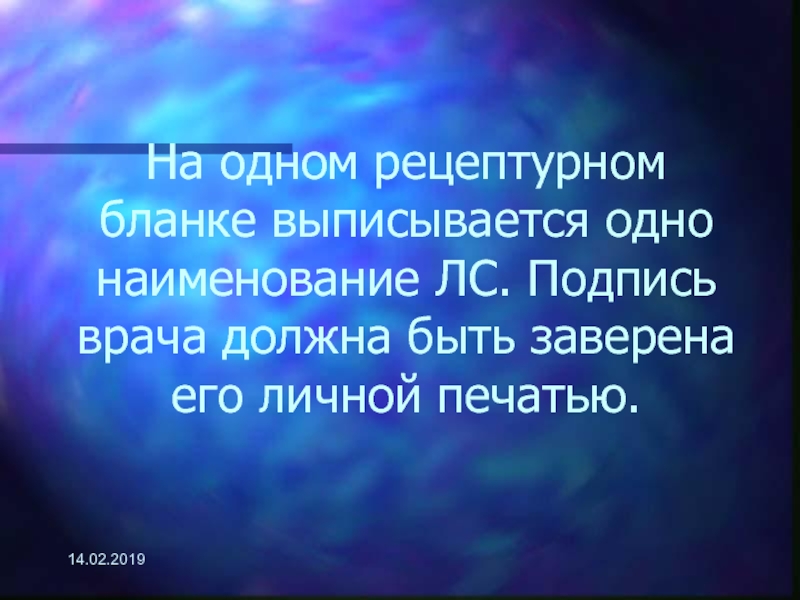 Слайд 18На одном рецептурном бланке выписывается одно наименование ЛС. Подпись врача