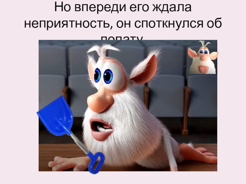 Слайд 6Но впереди его ждала неприятность, он споткнулся об лопату,