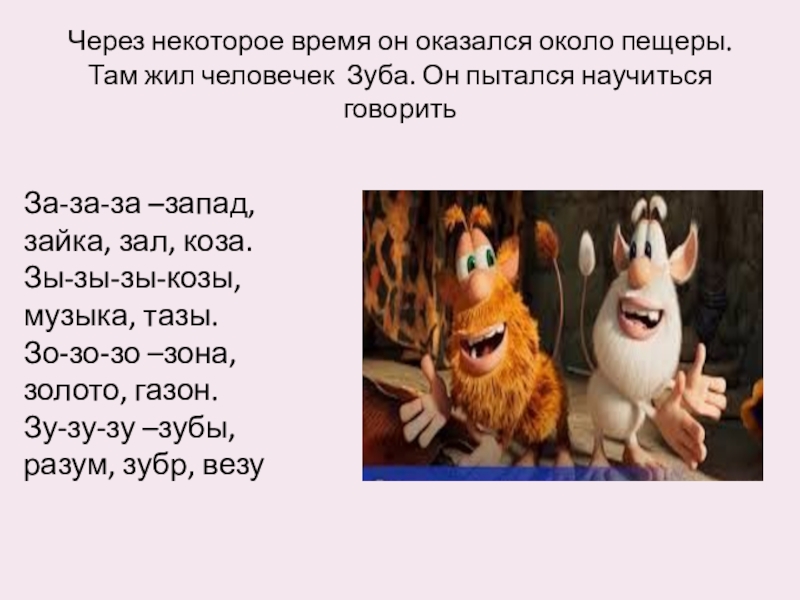 Через некоторое время он оказался около пещеры. Там жил человечек Зуба. Он пытался научиться говоритьЗа-за-за –запад, зайка,