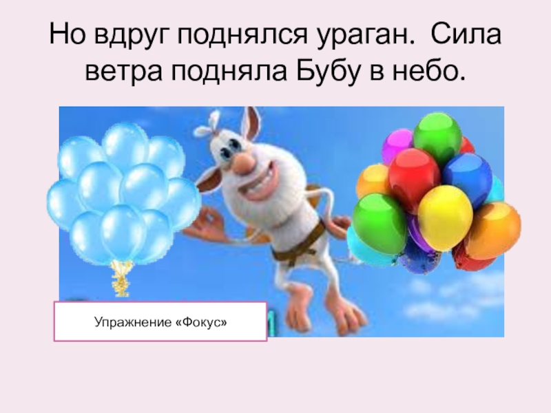 Но вдруг поднялся ураган. Сила ветра подняла Бубу в небо.Упражнение «Фокус»