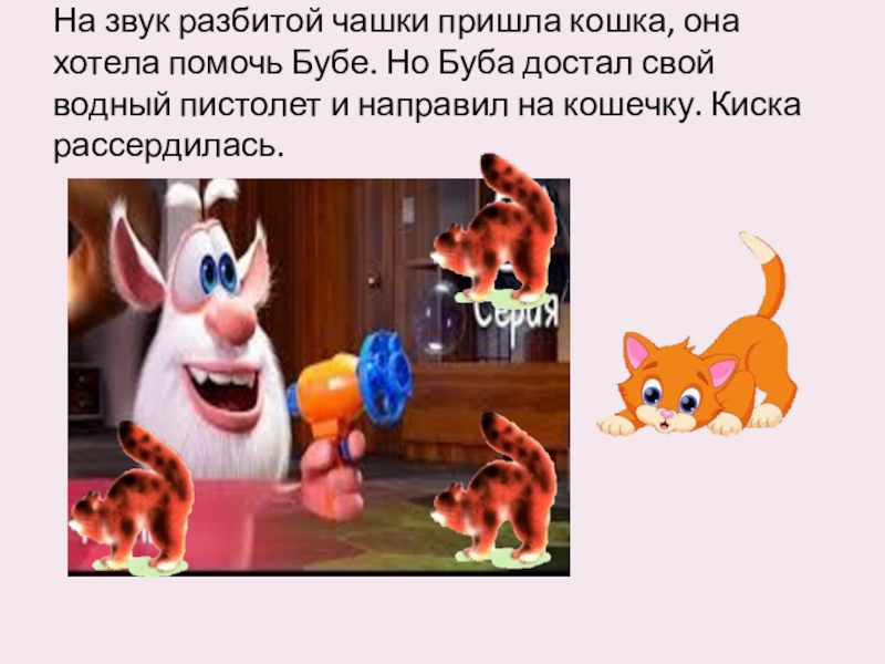 На звук разбитой чашки пришла кошка, она хотела помочь Бубе. Но Буба достал свой водный пистолет и