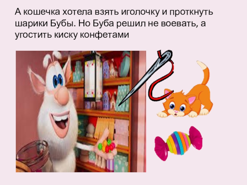Слайд 10А кошечка хотела взять иголочку и проткнуть шарики Бубы. Но