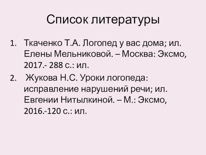 Список литературыТкаченко Т.А. Логопед у вас дома; ил. Елены Мельниковой. – Москва: Эксмо, 2017.- 288 с.: ил.
