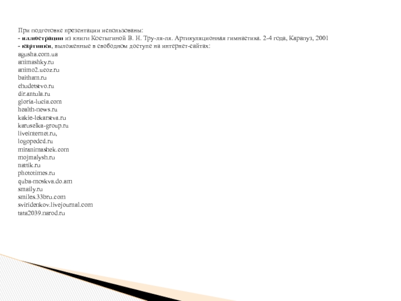 При подготовке презентации использованы: - иллюстрации из книги Костыгиной В. Н. Тру-ля-ля. Артикуляционная гимнастика. 2-4 года,