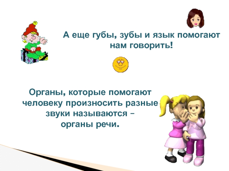 А еще губы, зубы и язык помогают нам говорить!Органы, которые помогают человеку произносить разные звуки называются –органы
