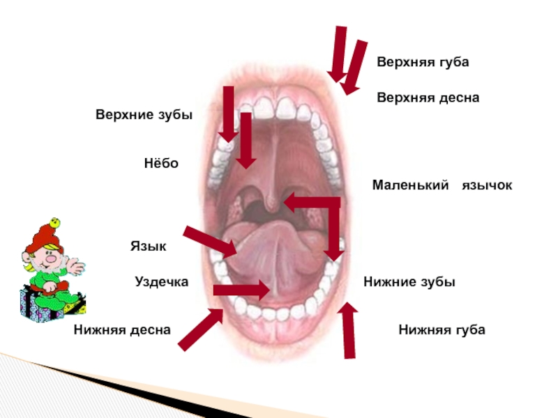 Маленький  язычокНёбоЯзыкВерхняя губаВерхняя деснаВерхние зубыНижние зубыНижняя деснаНижняя губаУздечка