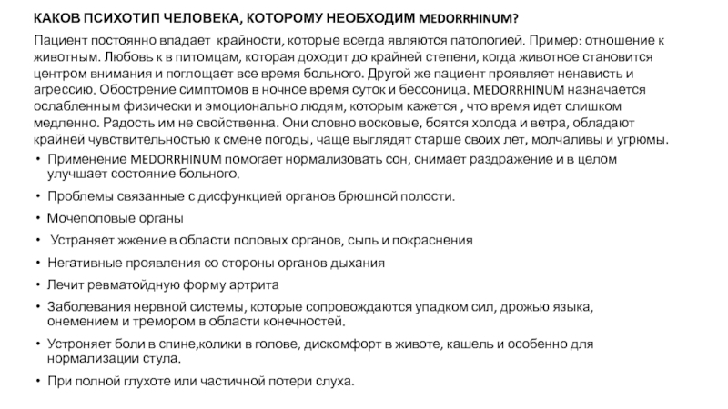 Пациент постоянно впадает крайности, которые всегда являются патологией. Пример: отношение к животным. Любовь к в питомцам, которая доходит до крайней степени, когда животное становится центром внимания и поглощает все время больного. Другой же пациент проявляет ненависть и агрессию. Обострение симптомов в ночное время суток и бессоница. MEDORRHINUM назначается ослабленным физически и эмоционально людям, которым кажется , что время идет слишком медленно. Радость им не свойственна. Они словно восковые, боятся холода и ветра, обладают крайней чувствительностью к смене погоды, чаще выглядят старше своих лет, молчаливы и угрюмы.