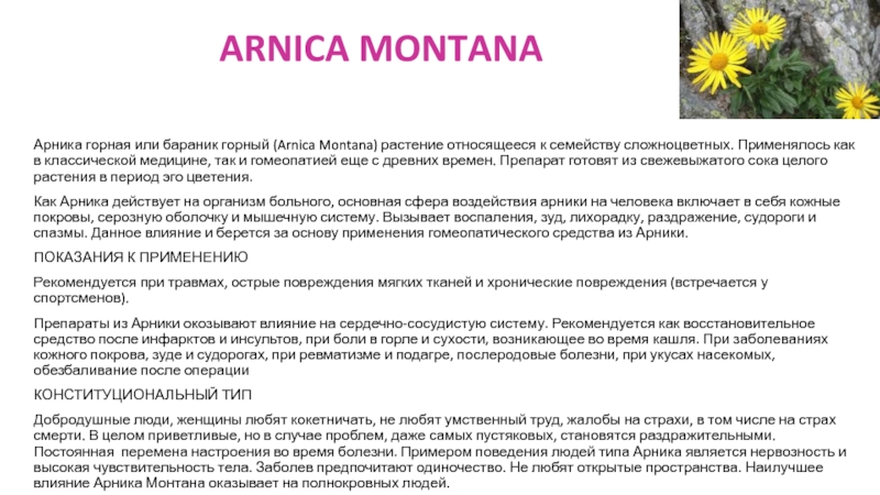 Добродушные люди, женщины любят кокетничать, не любят умственный труд, жалобы на страхи, в том числе на страх смерти. В целом приветливые, но в случае проблем, даже самых пустяковых, становятся раздражительными. Постоянная перемена настроения во время болезни. Примером поведения людей типа Арника является нервозность и высокая чувствительность тела. Заболев предпочитают одиночество. Не любят открытые пространства. Наилучшее влияние Арника Монтана оказывает на полнокровных людей.