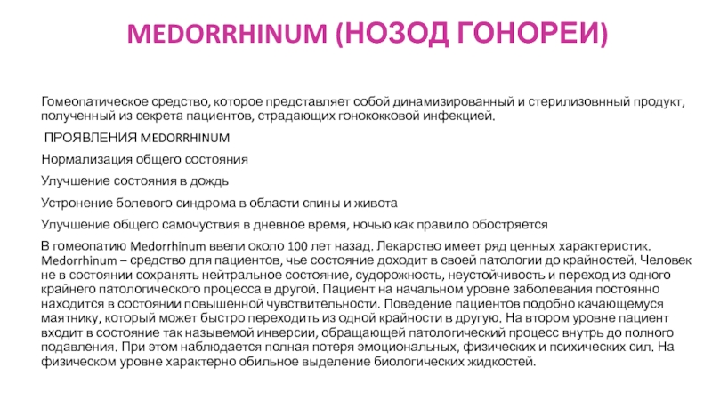 В гомеопатию Medorrhinum ввели около 100 лет назад. Лекарство имеет ряд ценных характеристик. Medorrhinum – средство для пациентов, чье состояние доходит в своей патологии до крайностей. Человек не в состоянии сохранять нейтральное состояние, судорожность, неустойчивость и переход из одного крайнего патологического процесса в другой. Пациент на начальном уровне заболевания постоянно находится в состоянии повышенной чувствительности. Поведение пациентов подобно качающемуся маятнику, который может быстро переходить из одной крайности в другую. На втором уровне пациент входит в состояние так назывемой инверсии, обращающей патологический процесс внутрь до полного подавления. При этом наблюдается полная потеря эмоциональных, физических и психических сил. На физическом уровне характерно обильное выделение биологических жидкостей.
