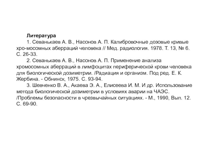 2. Севанькаев А. В., Насонов А. П. Применение анализа хромосомных аберраций в лимфоцитах периферической крови человека для биологической дозиметрии. /Радиация и организм. Под ред. Е. К. Жербина. - Обнинск, 1975. С. 93-94.