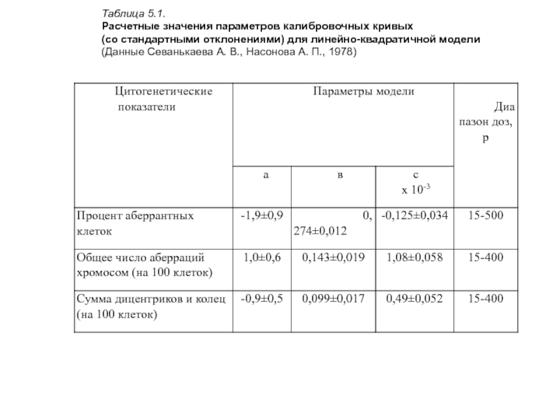 В таблице 5.1. приведены расчетные значения (со стандартными ошибками) параметров линейно-квадратичной модели, описывающей экспериментальные данные по всем трем исследованным цитогенетическим показателям.