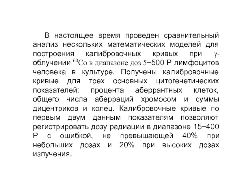 где У исследуемый цитогенетический показатель; D доза облучения; , , с параметры модели. Поэтому при построении калибровочных кривых для целей биологической дозиметрии по трем цитогенетическим тестам : общей частоте аберраций хромосом, суммарной частоте дицентрических и кольцевых хромосом и проценту аберрантных клеток, необходимо пользоваться линейно-квадратичной зависимостью эффекта от дозы.