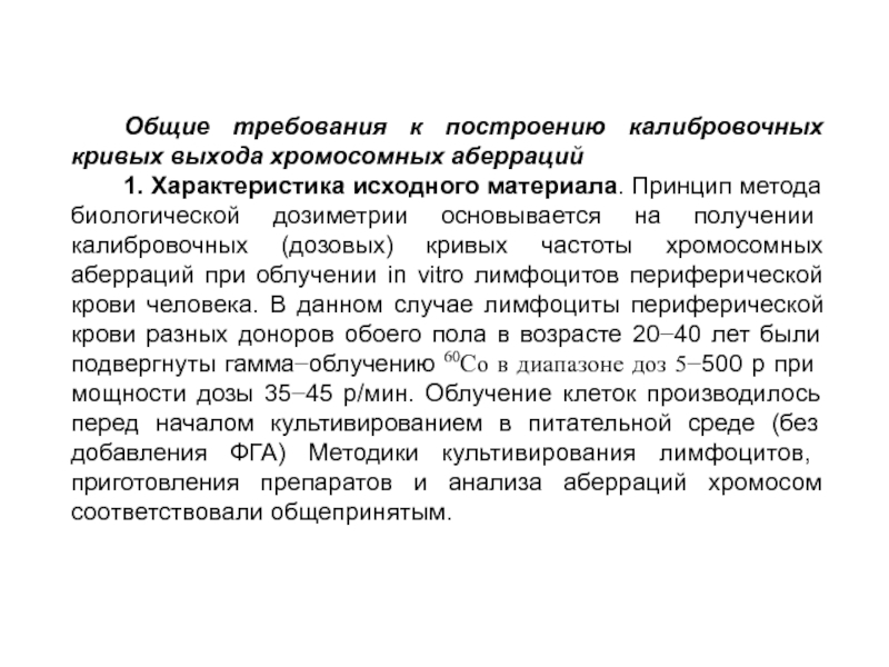 Слайд 3Общие требования к построению калибровочных кривых выхода хромосомных аберраций