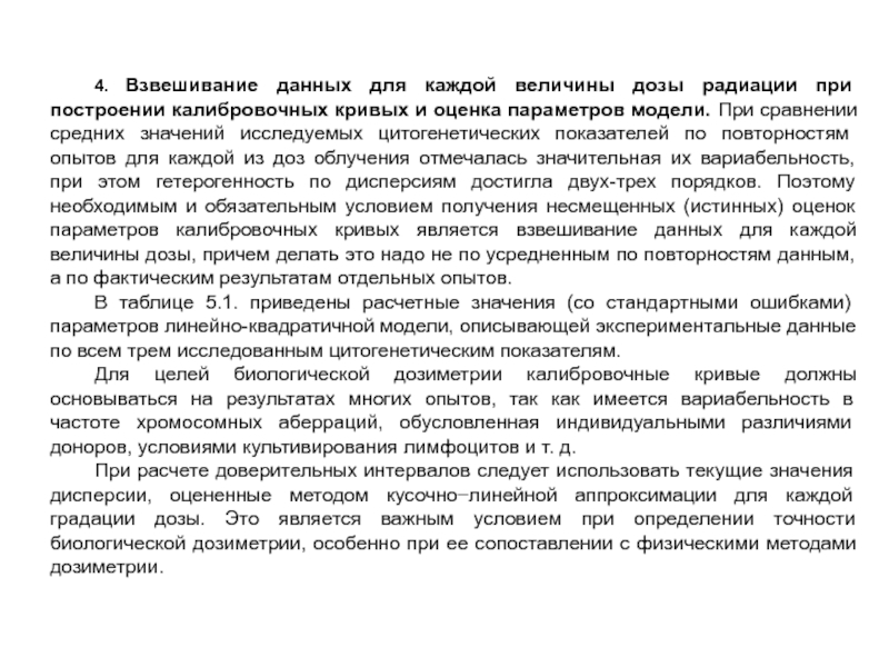 исследуемых цитогенетических показателей по повторностям опытов для каждой из доз облучения отмечалась значительная их вариабельность, при этом гетерогенность по дисперсиям достигла двух-трех порядков. Поэтому необходимым и обязательным условием получения несмещенных (истинных) оценок параметров калибровочных кривых является взвешивание данных для каждой величины дозы, причем делать это надо не по усредненным по повторностям данным, а по фактическим результатам отдельных опытов.