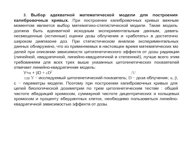 модель должна быть адекватной исходным экспериментальным данным, давать несмещенные (истинные) оценки дозы облучения и «работать» в достаточно широком диапазоне доз. При статистическом анализе экспериментальных данных обнаружено, что из применяемых в настоящее время математических моделей при описании зависимости цитогенетического эффекта от дозы радиации (линейной, квадратичной, линейно-квадратичной и степенной), лучше всего этим требованиям для всех трех выше указанных цитогенетических показателей отвечает линейно-квадратичная модель: