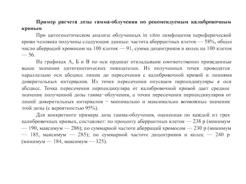 На графиках А, Б и В по оси ординат откладываем соответственно приведенные выше значения цитогенетических показателен. Из полученных точек проводятся параллельно оси абсцисс линии до пересечения с калибровочной кривой и линиями доверительных интервалов. Из точек пересечения опускаем перпендикуляры к оси абсцисс. Точка пересечения перпендикуляра от калибровочной кривой дает среднее значение полученной дозы гаммаоблучения, а точки пересечения перпендикуляров от линий доверительных интервалов минимально и максимально возможные значения этой дозы (с вероятностью 95%).