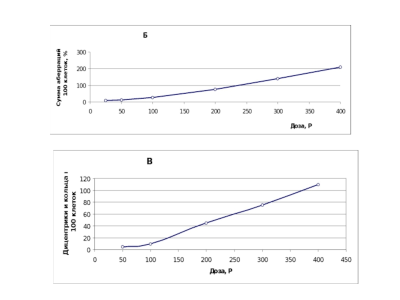 дозы по цитогенетическим показателям: проценту аберрантных клеток (А), общему числу аберраций хромосом (Б) и сумме дицентриков и колец (В).