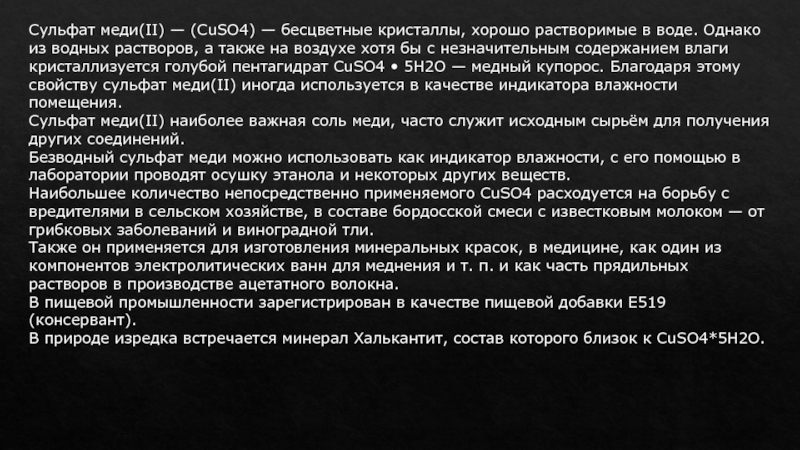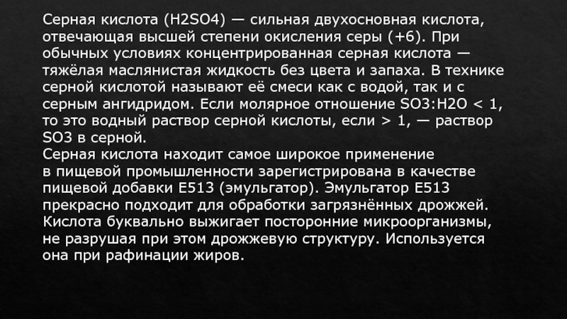 тяжёлая маслянистая жидкость без цвета и запаха. В технике серной кислотой называют её смеси как с водой, так и с серным ангидридом. Если молярное отношение SO3:H2O < 1, то это водный раствор серной кислоты, если > 1, — раствор SO3 в серной.Серная кислота находит самое широкое применение в пищевой промышленности зарегистрирована в качестве пищевой добавки E513 (эмульгатор). Эмульгатор E513 прекрасно подходит для обработки загрязнённых дрожжей. Кислота буквально выжигает посторонние микроорганизмы, не разрушая при этом дрожжевую структуру. Используется она при рафинации жиров.