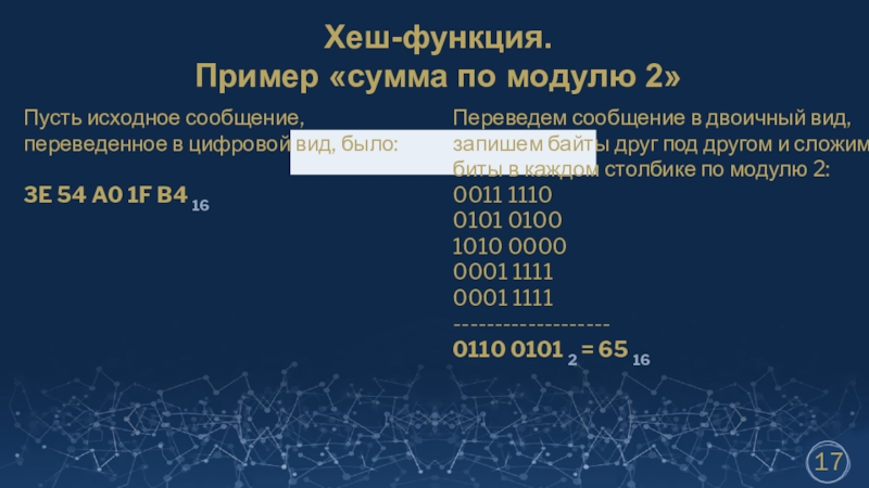 Переведем сообщение в двоичный вид, запишем байты друг под другом и сложим биты в каждом столбике по модулю 2: