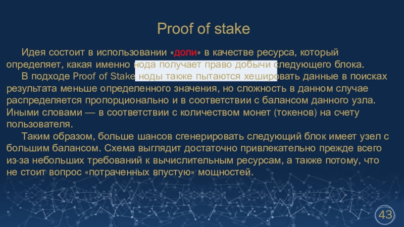 Идея состоит в использовании «доли» в качестве ресурса, который определяет, какая именно нода получает право добычи следующего блока.