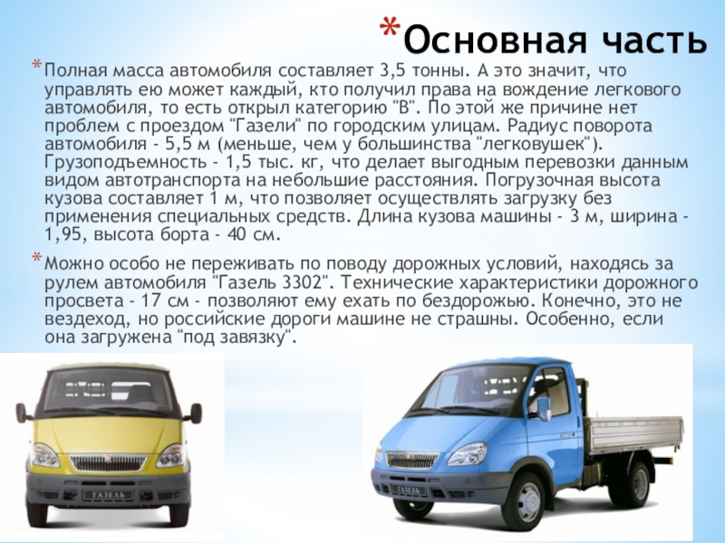 легкового автомобиля, то есть открыл категорию "В". По этой же причине нет проблем с проездом "Газели" по городским улицам. Радиус поворота автомобиля - 5,5 м (меньше, чем у большинства "легковушек"). Грузоподъемность - 1,5 тыс. кг, что делает выгодным перевозки данным видом автотранспорта на небольшие расстояния. Погрузочная высота кузова составляет 1 м, что позволяет осуществлять загрузку без применения специальных средств. Длина кузова машины - 3 м, ширина - 1,95, высота борта - 40 см.